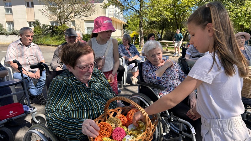 Les enfants, pleins d’énergie, se sont lancés à la recherche des œufs cachés, avant de venir les déposer dans les paniers posés sur les genoux des résidents. Quel bonheur de les voir courir partout !